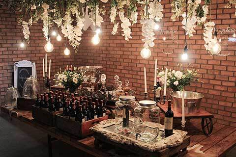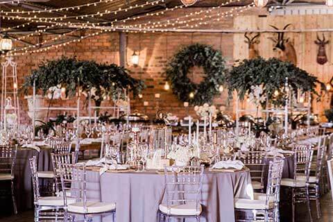 The reception area is decorated with chandeliers and has a rustic meets french country feel.